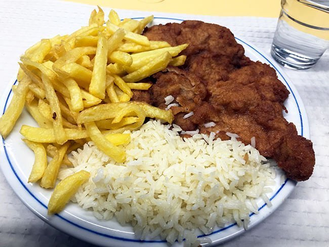 Precio: 22,90 € (bolinhos, bacalhau, escalope, 2 refrescos y un café)