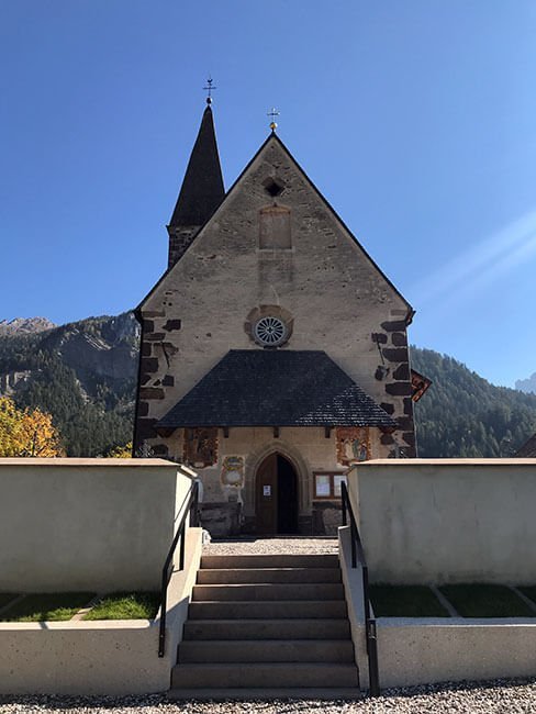 La iglesia de San Giovani (Kirche St. Johann in Ranui) fue nuestra primera parada y nos quedamos enamorados, una pequeña capilla en medio de un prado que tiene como telón de fondo las famosas montañas de los Dolomitas.