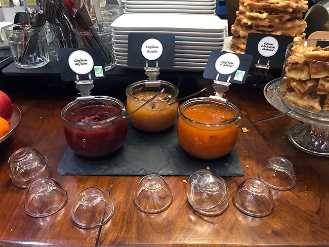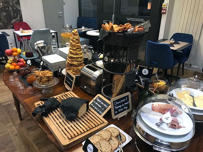 - El desayuno: con dulce (¡qué buenos los croissants franceses!), salado: huevos, embutidos y quesos,… además tenía una máquina para hacer zumo de naranja natural, tu mismo, al momento.