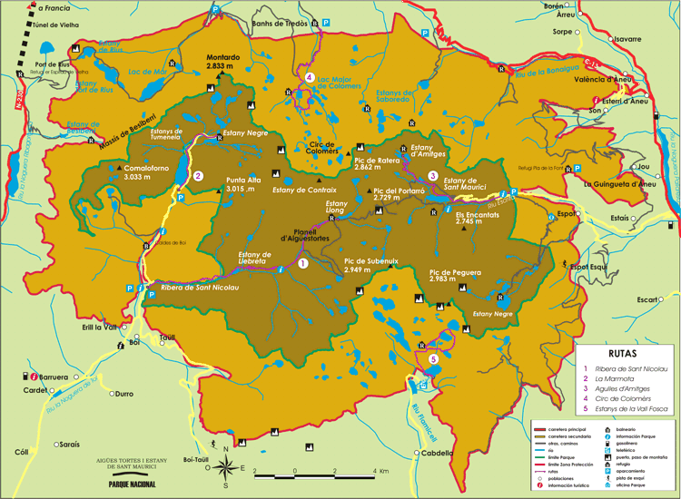 Hay que partir desde Boí. Desde allí, siguiendo la carretera L-500 hacia Caldes de Boí, y a unos dos kilómetros y medio, se encuentra el aparcamiento de la primera de las entradas (la de la Rivera de San Nicolau) y una pista forestal que lleva hacia el Parque.